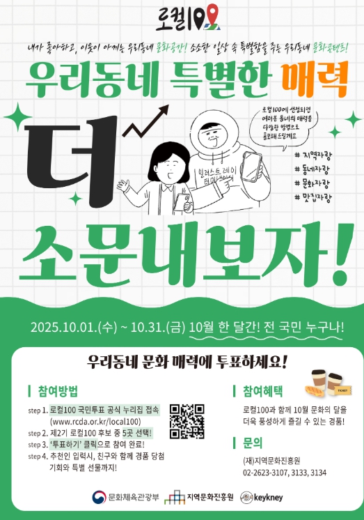 2차 심사는 온라인 국민투표와 전문가 대면 평가를 통해 최종 100개가 선정되며, 투표는 10월 31일까지 ‘로컬 100 투표 누리집에서 누구나 참여할 수 있다.