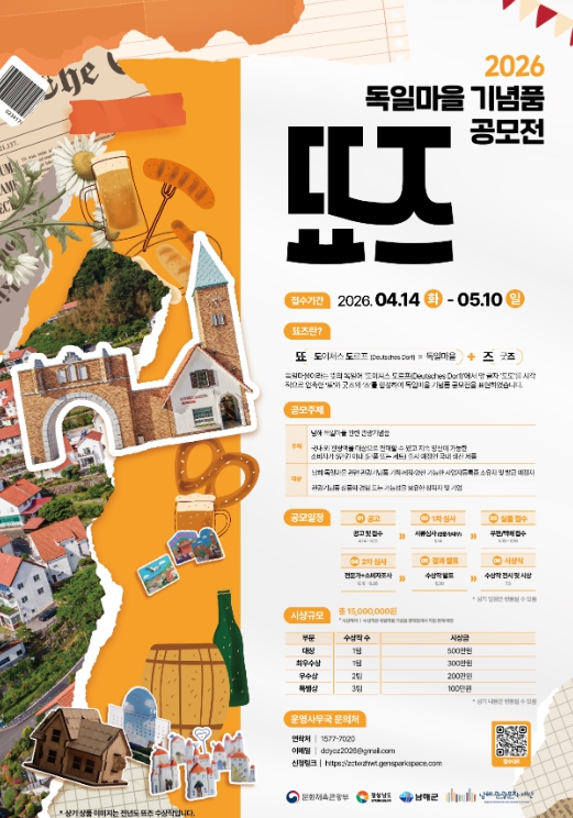[파이낸셜경제=김예빈 기자] 남해군관광문화재단이 ‘2026 독일마을 기념품 공모전, 뚀즈’를 개최하기로 하고, 4월 14일부터 5월 10일 18시까지 참가 접수를 진행한다고 밝혔다.