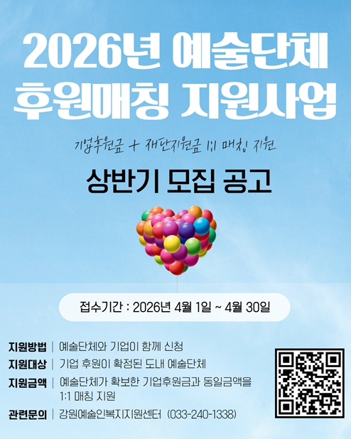 [파이낸셜경제=조성환 기자] 강원문화재단은 도내 예술단체의 안정적인 창작기반 마련과 기업의 문화예술 후원 참여 확대를 위해 '2026년 예술단체 후원매칭 지원사업' 상반기 공모를 추진한다.