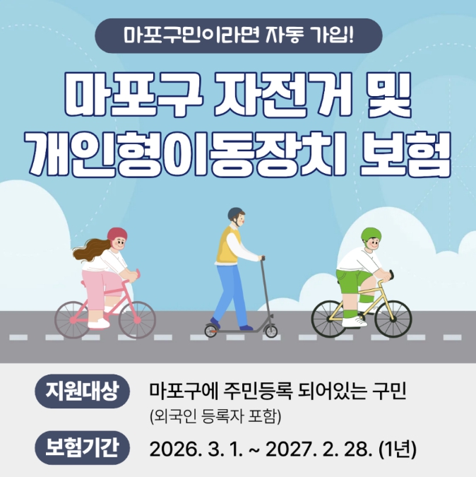 [파이낸셜경제=김예빈 기자] 마포구는 자전거와 개인형 이동장치(PM) 이용 중 발생할 수 있는 사고로부터 구민을 보호하기 위해 ‘2026년 마포구민 자전거 및 개인형 이동장치 단체보험’을 운영한다.