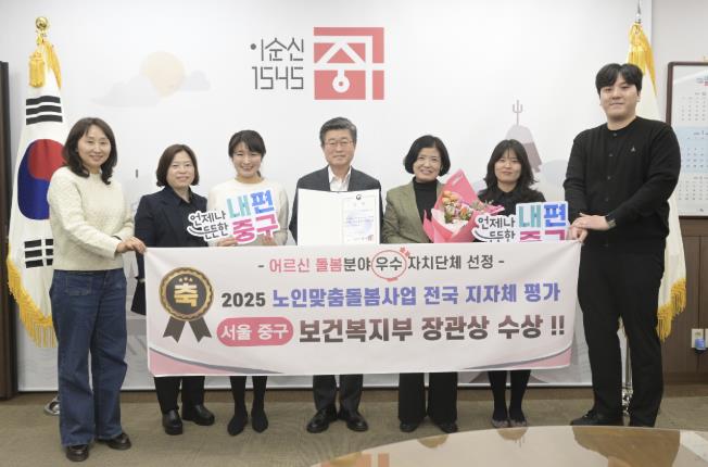 [파이낸셜경제=김예빈 기자] 서울 중구가 보건복지부 주관 ‘2025 노인맞춤 돌봄서비스 지자체 평가’에서 ‘우수’지자체로 선정돼 보건복지부 장관상을 수상했다. 구는 지역 돌봄 체계를 강화하고 스마트 기술을 도입해 어르신 일상 밀착 돌봄을 지원하며 높은 평가를 받았다.