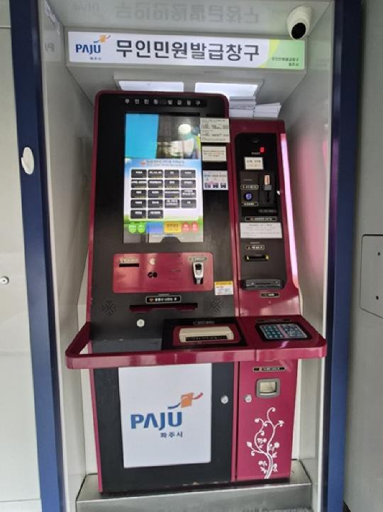 현재 파주시에는 총 45대(40개소)의 무인민원발급기가 설치되어 있으며, 18개 업무 123종의 민원서류 발급이 가능하다. 무인민원발급기 위치와 운영시간은 파주시청 또는 정부24 누리집에서 확인할 수 있다.
