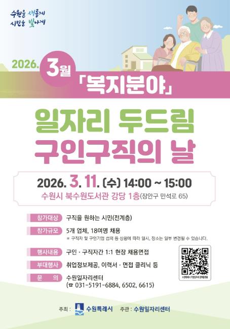 [파이낸셜경제=김기보 기자] 수원특례시는 3월 11일 오후 2시부터 3시까지 북수원도서관 강당에서 ‘3월 일자리 두드림 구인·구직의 날’을 개최한다.