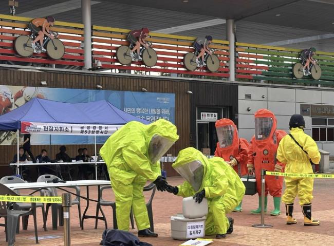 이날 훈련은 금정구보건소, 금정경찰서, 금정소방서, 제53보병사단 지역대 화생방테러특임대(CRST) 및 6339부대 2대대, 의료기관(세웅병원, 아름다운강산병원), 부산시설공단 스포원본부 총 7개 기관 120여 명이 참여해 현장감 있게 진행했다.