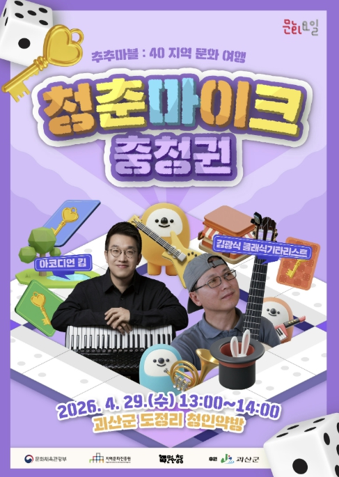 [파이낸셜경제=김기보 기자] 충북 괴산군은 지역 공간과 함께하는 거리공연 ‘청춘마이크’가 오는 29일과 5월 3일 두 차례에 걸쳐 개최된다고 밝혔다.