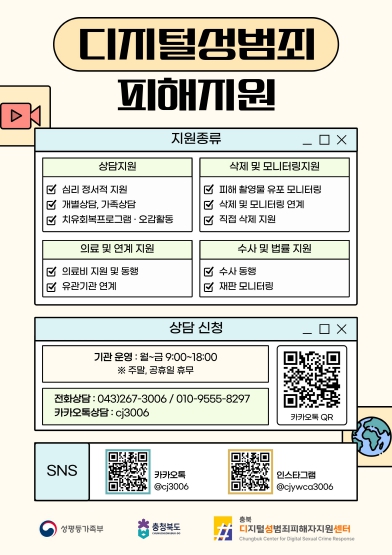 충북디지털성범죄피해자지원센터는 불법촬영물 삭제 지원을 비롯해 상담, 치료·회복 프로그램, 수사·법률 연계, 의료 지원 등 피해자 맞춤형 서비스를 제공하고 있으며, 2026년 1분기 기준 총 217건의 피해자를 지원했다. 주요 지원내용은 상담 135건, 삭제 지원 28건, 치료·회복 프로그램 30건, 수사·법률 지원 7건, 의료 지원 17건 등으로 나타났다.