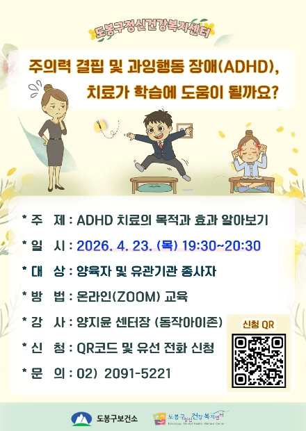 [파이낸셜경제=김예빈 기자] 서울 도봉구가 오는 4월 23일 오후 7시 30분 아동‧청소년 보호자와 관계 기관 종사자를 대상으로 주의력결핍 과잉행동장애(ADHD) 온라인 교육(ZOOM)을 진행한다.