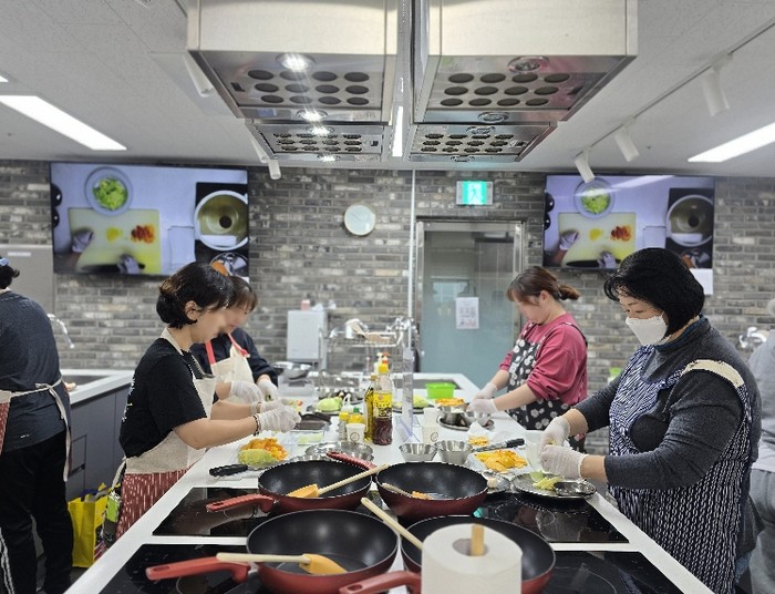 | ▲ 25년 11월 마들보건지소 2층 영양조리실에서 진행된 더바른식탁 조리실습 현장 |
