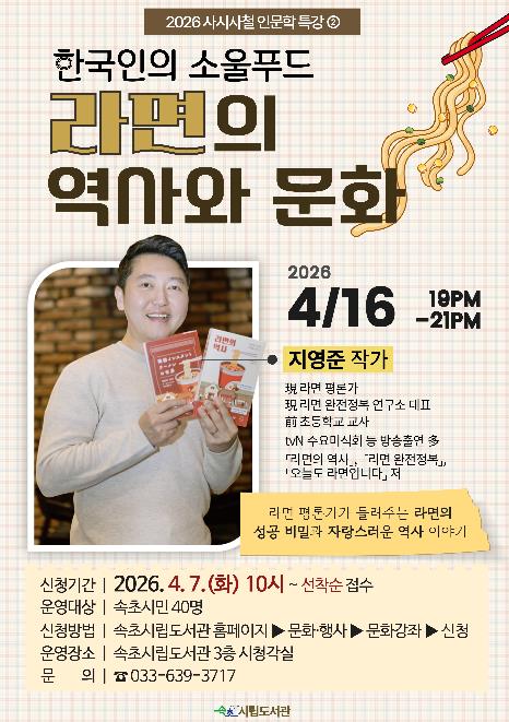 [파이낸셜경제=조성환 기자] 속초시립도서관은 4월 16일 19시 시청각실에서 속초시민 40여 명을 대상으로 사시사철 인문학 두 번째 프로그램 ‘한국인의 소울푸드, 라면의 역사와 문화’ 특강을 운영한다.