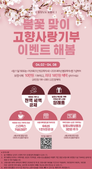 [파이낸셜경제=김영란 기자] 보령시가 제20회 주산 벚꽃축제와 2026 옥마산 봄꽃축제를 맞아 오는 4월 8일까지 ‘봄꽃 맞이 고향사랑기부 이벤트 해봄’을 진행한다.