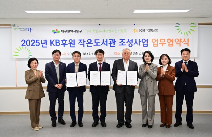 [파이낸셜경제=김지훈 기자] 대구 동구청은 지난 18일, KB은행, (사)작은도서관만드는사람들과 ‘작은도서관 조성사업’을 위한 업무협약을 체결했다.
