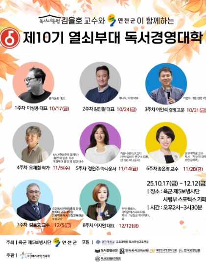 [파이낸셜경제=김기보 기자] 연천군과 육군 제5보병사단은 장병들의 지적 성장과 건전한 병영 독서문화 확산을 위한 '열쇠부대 독서경영대학' 제10기 개강식을 오는 10월 17일 개최한다. 이 프로그램은 2023년부터 전국 최초로 민·관·군 협력 독서교육으로 시작됐으며, 매 기수 약 50여 명의 군장병이 수료하며 꾸준한 호응을 얻고 있다.