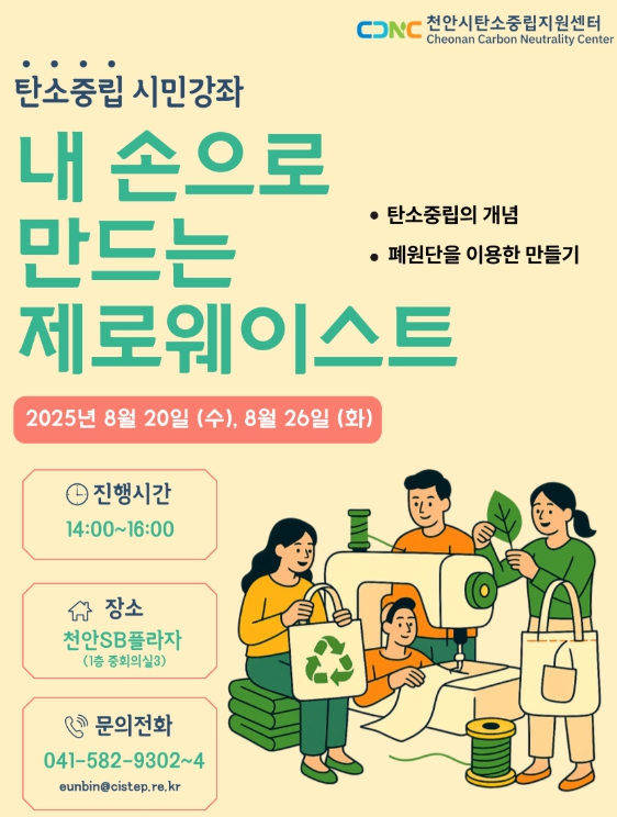 강좌는 오는 8월 20일과 26일에 진행되며, 자세한 내용은 천안시 탄소중립지원센터 누리집을 통해 확인할 수 있다.