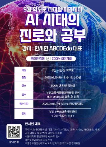 [파이낸셜경제=박영진 기자] 부산광역시교육청교육연구정보원 SW‧AI교육거점센터는 오는 23일 오후 6시 온라인 원격 연수를 통해 관내 학부모를 대상으로 ‘9월 학부모 디지털 아카데미’를 실시한다.