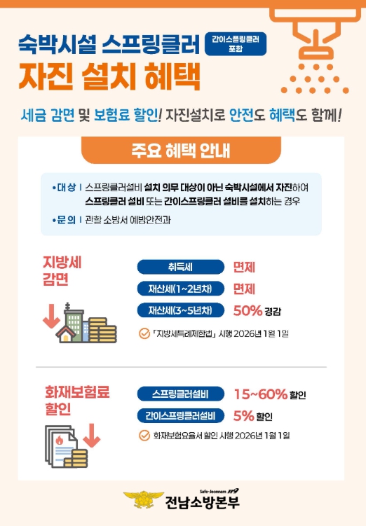 [파이낸셜경제=김예빈 기자] 전라남도소방본부는 2026년 1월 1일부터 숙박시설이 자발적으로 스프링클러 등 소방시설을 설치할 경우 지방세 감면과 화재보험료 할인 혜택을 제공한다고 밝혔다.
