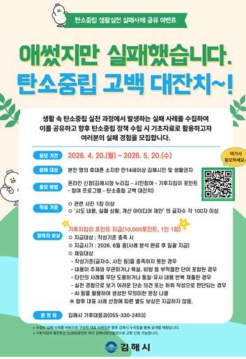시 관계자는 “탄소중립 실천 과정에서의 실패 경험은 개인의 문제가 아니라 사회적 여건과 제도 개선이 필요한 부분을 보여주는 중요한 자료”라며 “시민들이 부담 없이 경험을 공유하고 공감할 수 있는 계기가 되길 기대한다”고 밝혔다.