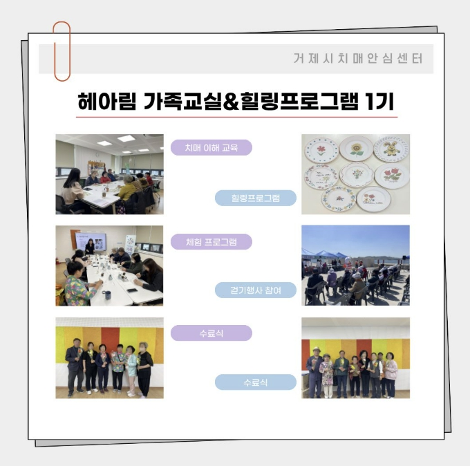 [파이낸셜경제=김예빈 기자] 거제시치매안심센터는 치매 대상자 가족 지원을 위해 3월부터 4월까지 8주간 ‘헤아림 가족교실’과 ‘힐링프로그램’ 1기를 성공적으로 운영하고 지난주 수료식을 개최했다.