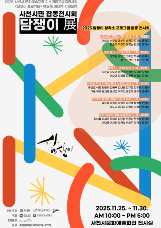 [파이낸셜경제=김예빈 기자] 사천문화재단은 오는 11월 25일부터 11월 30일까지 2025 사천시문화예술회관 전시실에서 담쟁이 프로젝트 합동 전시회 '담쟁이 展'을 개최한다.