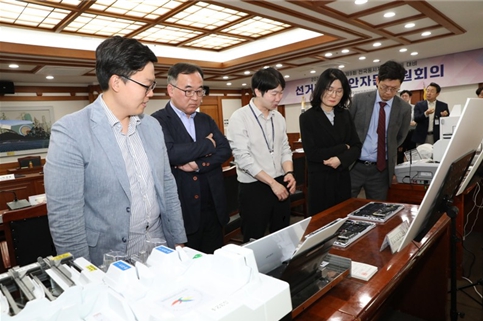 | ▲ 4. 28. 오후 2시 중앙선관위 과천청사에서 개최한 제9회 지선 선거ICT 보안자문위원회 회의에서 자문위원들이 투표지분류기 보안체계 등을 확인하고 있다. |