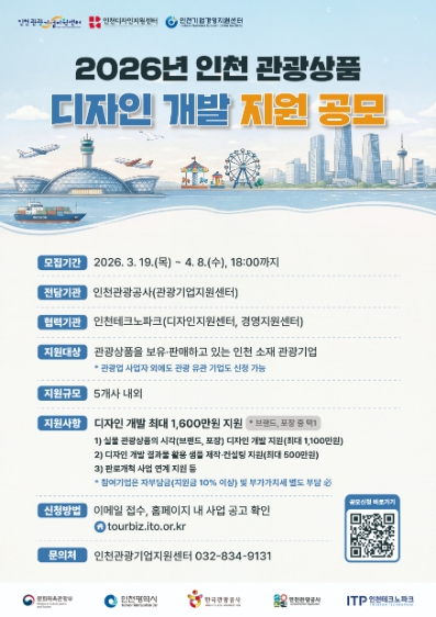 [파이낸셜경제=금윤지 기자] 인천광역시와 인천관광공사는 지역 관광상품의 시장 경쟁력을 강화하고 브랜드 가치를 높이기 위해 '2026년 인천 관광상품 디자인 개발 지원 사업'에 참여할 기업을 3월 19일부터 4월 8일까지 모집한다고 밝혔다.