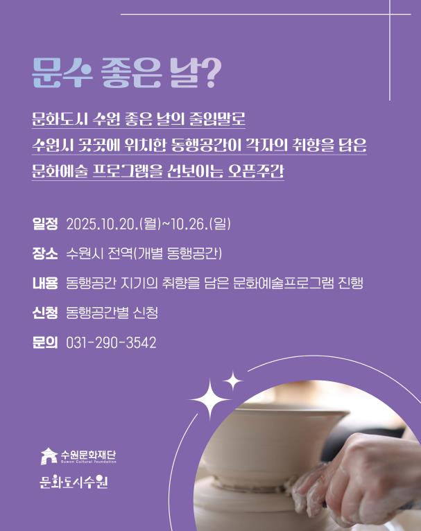‘문수 좋은 날’은 ‘문화도시 수원 좋은 날’의 줄임말로, 수원시 전역에 흩어진 동네 문화 거점이자 문화도시 수원과 함께하는 ‘동행공간’에서 문화예술 프로그램을 일주일간 집중적으로 시민들에게 선보이는 기간이다.