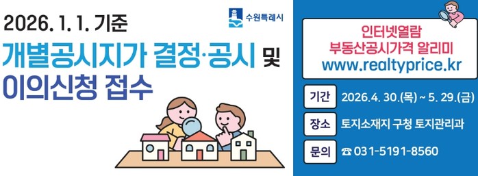 | ▲ 수원시 영통구, 2026. 1. 1. 기준 개별공시지가 결정·공시 및 이의신청 접수 시작 |
