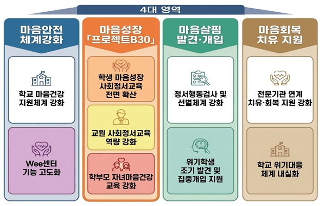 이번 계획의 핵심은 학생의 마음건강을 예방–발견–개입–회복 전 과정에서 체계적으로 지원하는 학교 중심 통합 지원체계 구축이다. 부산교육청은 ‘마음안전–마음성장–마음살핌–마음회복’의 4단계 체계를 통해 학생의 정서적 어려움이 위기로 이어지지 않도록 촘촘히 지원할 방침이다.