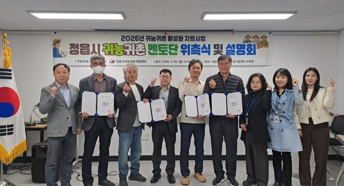 [파이낸셜경제=김예빈 기자] 정읍시가 지역 농촌에 젊은 활기를 불어넣고 청년 귀농귀촌인들의 안정적인 정착을 돕기 위해 지난 30일 귀농귀촌종합지원센터에서 ‘2026년 귀농귀촌 멘토단 위촉식’을 열고 본격적인 맞춤형 지원에 나섰다.