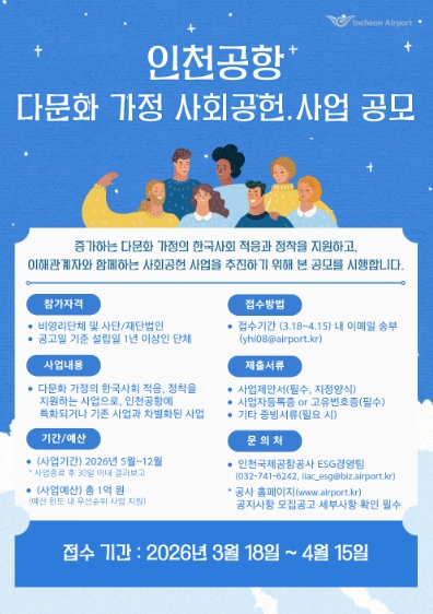[파이낸셜경제=김기보 기자] 인천국제공항공사는 다문화 가정의 한국사회 정착을 위한 사회공헌 사업에 참여할 기업을 공모한다고 17일 밝혔다.