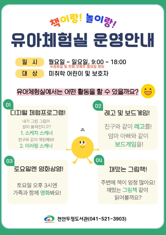 [파이낸셜경제=김영란 기자] 천안시 두정도서관은 미취학 아동을 위한 ‘놀이 기반 독서 환경’인 유아체험실을 운영해 주민들로부터 호응을 얻고 있다고 12일 밝혔다.