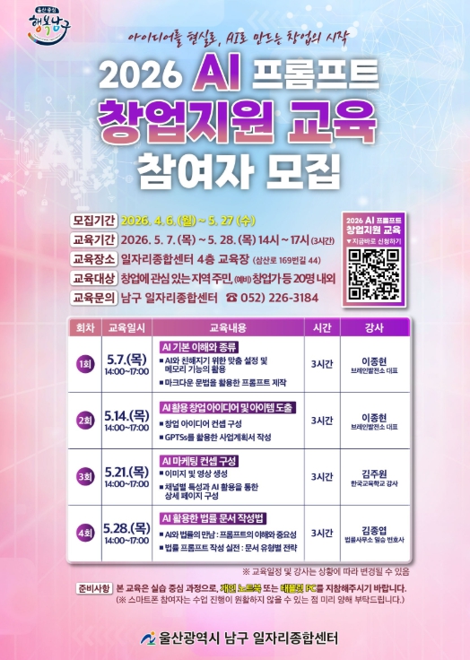 [파이낸셜경제=김예빈 기자] 울산 남구 일자리종합센터는 급변하는 AI(인공지능) 산업 환경에 발맞춰 지역 예비 창업자들을 위한 ‘2026 Al 프롬프트 창업지원 과정’ 교육생을 모집하고 있다고 17일 밝혔다.