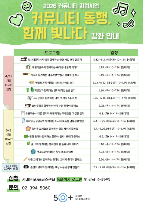 [파이낸셜경제=김예빈 기자] 서대문구가 운영하는 서대문50플러스센터가 중장년의 자기 계발과 사회참여를 지원하는 교육 프로그램 ‘커뮤니티 동행, 함께 빛나다’를 센터 내 강의실과 야외 현장에서 5∼7월 운영한다.
