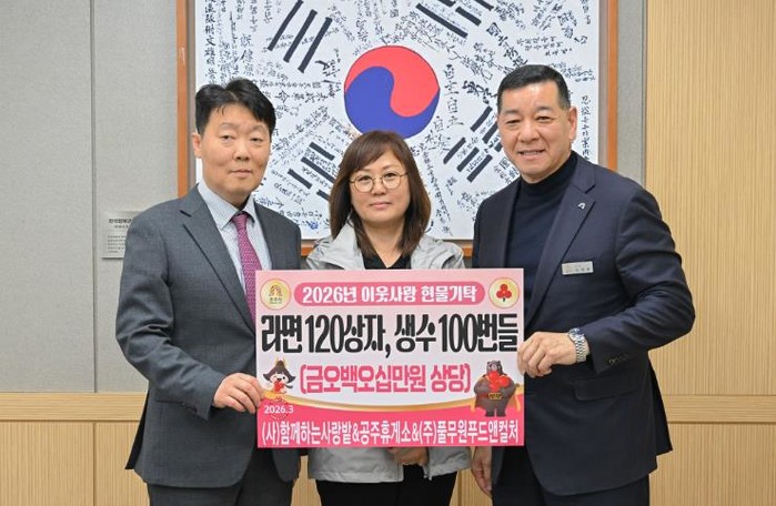 이날 세 기관은 라면 120상자와 생수 100묶음 등 총 550만 원 상당의 물품을 기탁했으며, 해당 물품은 공주시 16개 읍면동의 취약계층에게 전달될 예정이다.