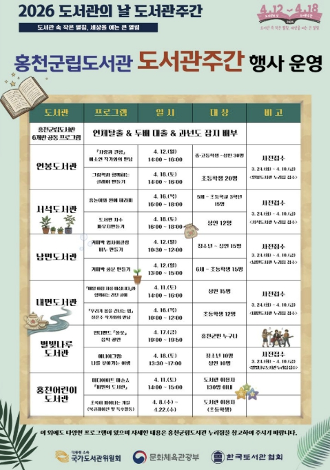 [파이낸셜경제=조성환 기자] 홍천 군립 도서관은 2026년 도서관의 날(4월 12일)과 도서관 주간(4월 12일~18일)을 기념해, 4월 한 달간 군민들을 위한 다채로운 독서 문화 프로그램을 운영한다.