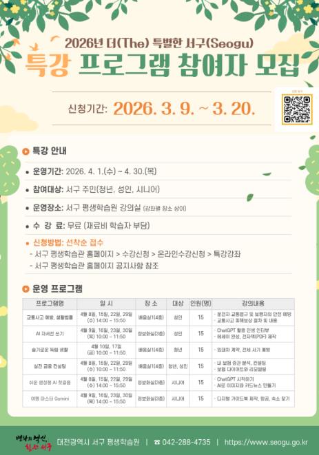 [파이낸셜경제=김영란 기자] 대전 서구 평생학습원은 ‘2026년 봄학기 더(The) 특별한 서구(seogu)’특강 참여자를 모집한다고 9일 밝혔다.