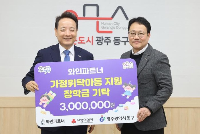 [파이낸셜경제=김예빈 기자] 광주 동구는 지난 13일 와인파트너(대표 권홍식)로부터 가정위탁아동을 위한 장학금 3백만 원을 기탁받았다고 밝혔다.
