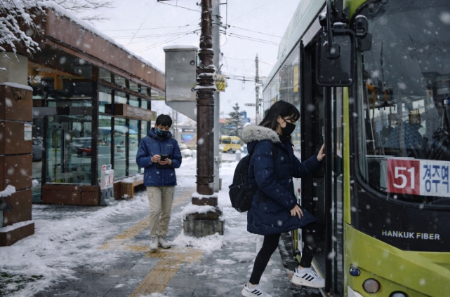 | ▲ 눈 내리는 날 경주 황성공원·시립도서관 버스정류장에서 청소년들이 시내버스에 탑승하고 있다. |