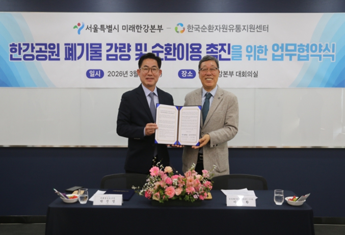[파이낸셜경제=김예빈 기자] 서울시 미래한강본부가 12일 한강공원 내 폐기물 감량 및 순환이용 촉진을 위해 폐기물 재활용 분야 전문기관인 한국순환자원유통지원센터(KOrea Resource circulation service Agency, KORA)와 업무협약을 체결했다.