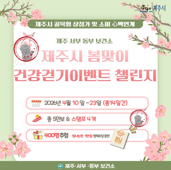 [파이낸셜경제=김영란 기자] 제주보건소는 봄철을 맞아 시민들의 걷기 실천을 활성화하기 위해 4월 10일부터 4월 23일까지 ‘골목형 상점가 연계 봄맞이 건강 걷기 이벤트 챌린지’를 운영한다.