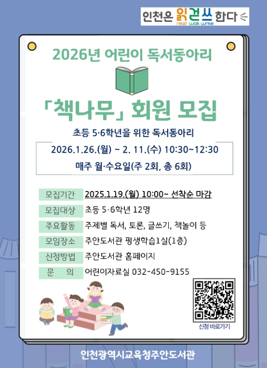 [파이낸셜경제=김기보 기자] 인천광역시교육청주안도서관은 예비 초등 5·6학년 학생을 대상으로 하는 독서동아리 '책나무' 회원을 모집한다.
