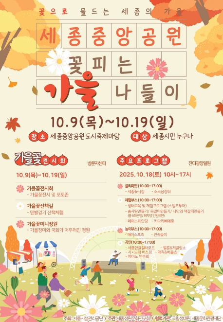 세종특별자치시시설관리공단은 오는 10월 9일부터 19일까지 세종중앙공원 도시축제마당 일원에서 ‘세종중앙공원 꽃피는 가을 나들이’ 행사를 개최한다고 밝혔다.