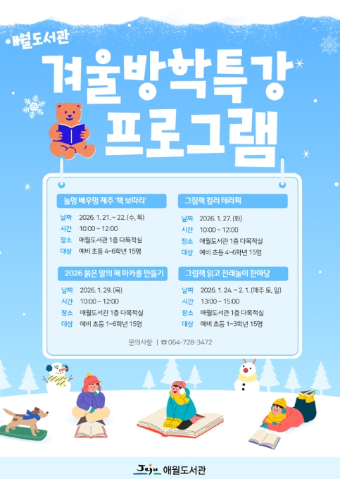 [파이낸셜경제=김영란 기자] 제주시 애월도서관은 겨울방학을 맞아 어린이들이 책과 놀이, 체험 활동을 통해 즐겁게 배우고 독서에 대한 흥미와 창의력을 키울 수 있도록 ‘2026 애월도서관 겨울방학특강 프로그램’을 운영한다.