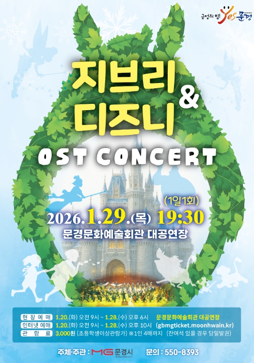 [파이낸셜경제=김지훈 기자] 문경문화예술회관에서는 신년 겨울 방학을 맞아 인기 애니메이션 대표곡들을 들려주는 지브리 ·디즈니 OST 콘서트 공연을 1월 29일 19:30 (1일 1회)에 문경문화예술회관 대공연장에서 개최한다.
