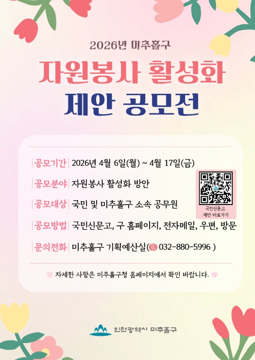 [파이낸셜경제=김기보 기자] 인천 미추홀구는 지역의 사회문제를 해결하고 자원봉사 문화를 확산하기 위해 ‘2026년 자원봉사 활성화 제안 공모전’을 개최한다고 6일 밝혔다.