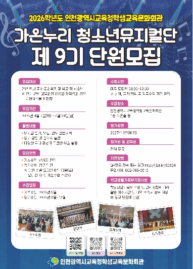 [파이낸셜경제=김기보 기자] 인천광역시교육청학생교육문화회관은 4월 7일부터 24일까지 인천 지역 청소년을 대상으로 ‘2026년 청소년뮤지컬단 제9기’ 신규 단원을 모집한다.