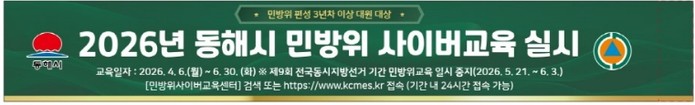[파이낸셜경제=조성환 기자] 동해시는 민방위 대원의 교육 편의성을 높이고 재난 대응 역량을 강화하기 위해 오는 4월 6일부터 6월 30일까지 상반기 민방위 사이버 교육을 실시한다고 밝혔다.