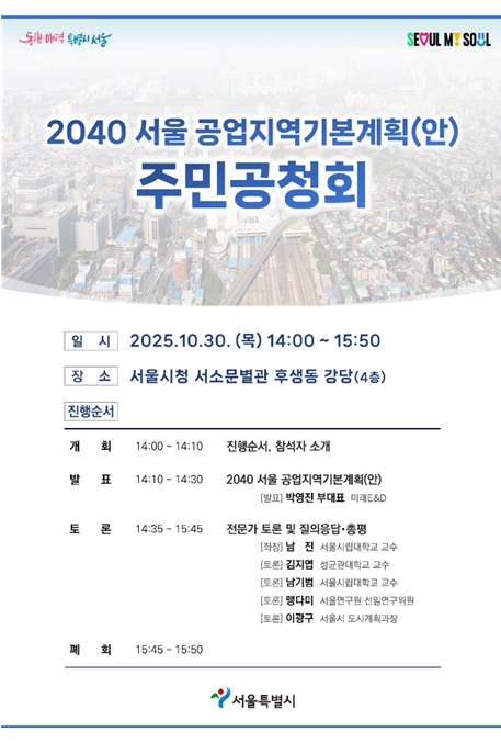 공청회에서는 '2040 서울 공업지역 기본계획(안)'과 관련하여 시민과 관계 전문가 등의 의견을 듣고, 산업혁신구역 시범사업 설명회도 함께 개최되어 제도취지, 신청요건, 평가기준 등에 대한 안내도 이루어진다.