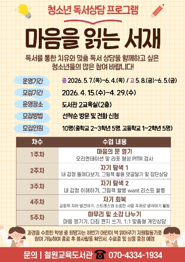 [파이낸셜경제=조성환 기자] 철원교육도서관(관장 김민서)은 5월 7일부터 6월 5일까지 2교육실에서 중·고생 10명을 대상으로 청소년 독서 상담·교육봉사 ‘나1너2(나읽너들)’ 프로그램을 운영한다.