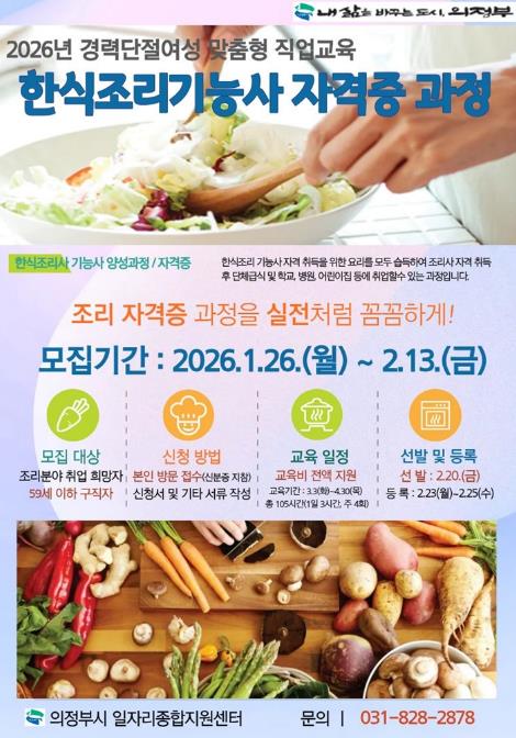 [파이낸셜경제=김기보 기자] 의정부시는 경력단절여성의 안정적인 재취업을 지원하기 위해 ‘2026년 한식조리기능사 자격증 과정’ 참여자를 모집한다.