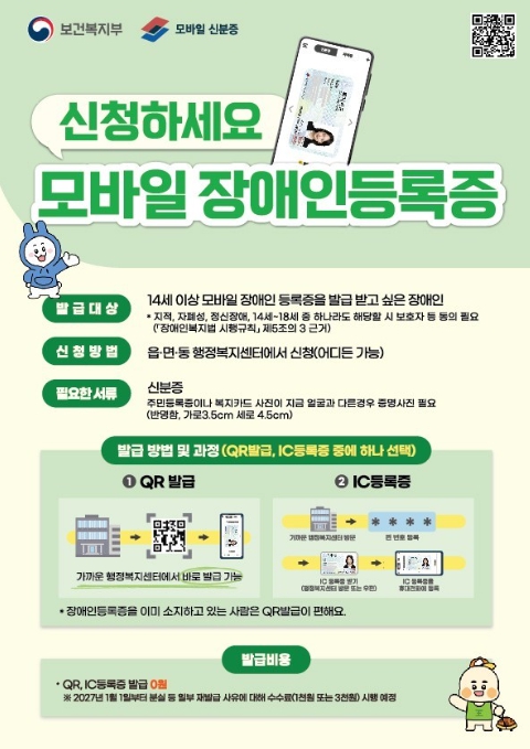[파이낸셜경제=김영란 기자] 서귀포시는 디지털 행정서비스 확대 및 장애인 편의성 향상을 위해 1월 22일부터 모바일 장애인등록증 발급을 본격 추진하고 IC 장애인등록증 최초 발급 수수료를 지원한다.